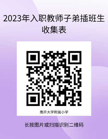 按照南開區教育局規定從即日起不再辦理六年級學生的插班工作。因此附小僅能接收當年南開大學各院(系)引進人才教職工子弟(二代)一至五年級的學生,并為其辦理插班手續。如有需要的家長,請您在8月18日前掃描下方二維碼進行登記填寫。